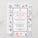 This classically styled invitation is perfect for summer beach parties, receptions, barbecues or boils. The front features charming line drawings of different beach themed objects: seashells, lobsters, crabs, a lighthouse and a compass, among others. The navy blue illustrations are highlighted with accents of coral against a crisp white background. Customise the centre section with your own event information using the easy provided templates. The back side of the invitation has a pattern of modern vertical stripes in coral and white. Classic, elegant and on trend.