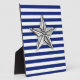 A silver chrome like star design on a navy blue stripes decor. A modern nautical gift.