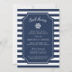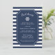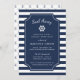 Summery nautical themed rehearsal dinner invitations in classic navy blue and white feature a navy and white striped background with your event information in white on a navy blue centre element, accented by a ship's wheel illustration. Perfect for rehearsal dinners on yachts, sailboats, or dinner cruises at marina, boat club or nautical theme venues. Invitations reverse to a pattern of tiny navy anchors.