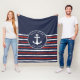 Nautical Striped Navy Blue Red White Anchor Fleece Blanket