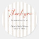 Sweet and simple round thank you stickers for your "She's a Catch" lobster-themed bridal shower! Featuring elegant beige watercolor stripes with bold red "Thank you" script and "for celebrating with us!" message. Fully customizable with the bride's name and event date – perfect for sealing favor bags, envelopes, thank you cards, or gift boxes.