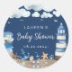 Nautica Navy Baby Shower round Sticker featuring a nautical theme with sea, sea shells, boats, and lighthouse artwork