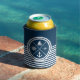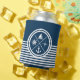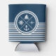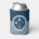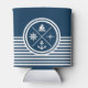 Nautical themed design with nautical symbols (anchor, sailing boat, sailing wheel, compass) decoration on white and navy blue striped background.