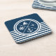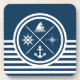 Nautical themed design with nautical symbols (anchor, sailing boat, sailing wheel, compass) decoration on white and navy blue striped background.