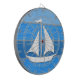 Nautical themed design with sailing boat decoration on striped blue and grey wooden background. Please note this is not made of wood, it is a wood graphic print.