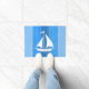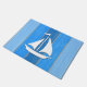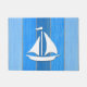 Nautical themed design with sailing boat decoration on striped blue and grey wooden background. Please note this is not made of wood, it is a wood graphic print.