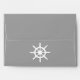 Nautical themed design with sailing wheel decoration on striped blue and grey wooden background. Please note this is not made of wood, it is a wood graphic print.