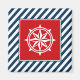 Nautical themed design with compass decoration in square on blue and white striped background
