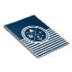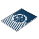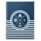 Nautical themed design with nautical symbols (anchor, sailing boat, sailing wheel, compass) decoration on white and navy blue striped background.