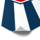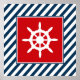 Nautical themed design with sailing wheel decoration in square on blue and white striped background