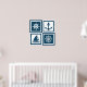 Nautical themed design with sailing wheel, sailing boat,compass and anchor decoration in white and blue striped squares