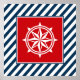 Nautical themed design with compass decoration in square on blue and white striped background