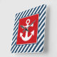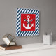 Nautical themed design with anchor decoration in square on blue and white striped background