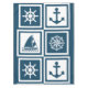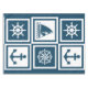 Nautical themed design with sailing wheel, sailing boat,compass and anchor decoration in white and blue striped squares