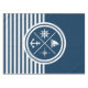 Nautical themed design with nautical symbols (anchor, sailing boat, sailing wheel, compass) decoration on white and navy blue striped background.
