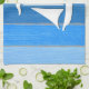 Nautical themed design with sailing boat decoration on striped blue and grey wooden background. Please note this is not made of wood, it is a wood graphic print.