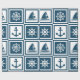 Nautical themed design with sailing wheel, sailing boat,compass and anchor decoration in white and blue striped squares
