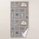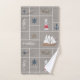 Nautical themed illustration with sea horse, sailing boat, sailing wheel, anchor, lighthouse, fish, seashell, starfish and compass decoration in rectangles on grunge sandy background