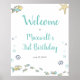 This darling 3rd birthday welcome sign features a cute under the sea theme with turquoise and black text. Matching stationery and party supplies available.