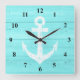 Nautical wall clock | boat anchor and wood panels. Turquoise blue and white design with wooden boards and weather navy ship anchor. Maritime gift idea. Beach theme room decor / house decoration. Large square or small round size.