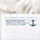 This custom address label features a nautical design. A navy blue coloured boat anchor is printed near the centre. Sea waves or a water pattern appears near the top in a pale blue colour, with darker waves floating across the bottom. A sample name and address are printed to the left of the anchor in a sophisticated blue font. It's perfect for a boating lover.