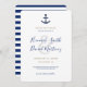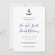 This unique custom nautical themed wedding save the date flat card template features an anchor and your details on a white base. The anchor isn't uniformly coloured, which lends a warm, weathered look and handmade flavour that reminds us of a woodblock print or a wood carving. In fact, the illustration that inspired this design was originally made with a simple stamp, which accounts for its charm. You might change 'save the date' to 'save our date' or something else of your choosing. You can also change the style and colour of any of the text. We chose a default setting of a rather loose, relaxed style of script for the names. But there are many other fonts in the editing tools including lots of different scripts, so please experiment and you're bound to find a script or other font that suits your style. The ampersand '&' symbol under your names and the anchor colour are the only elements that cannot be changed. We chose a shade of deep navy blue that's sometimes called dark sapphire(hex colour #082567) for the names, anchor and border, and an elegant gold called California Gold(colour #A98F64) for 'save the date', your date and location. If you prefer a different colour or colours, you can change this. You can also change the border colour from deep navy to something else, perhaps the same gold with the hex number we used for some of the text. On the back, we've used the same deep navy for the horizontal stripes motif. You might choose to delete this design and instead choose a solid colour, perhaps the same gold or navy we've used on the front, or a simple white, or another colour that suits your taste. We've chosen a card with rounded corners in our example, but you can of course choose a card with sharp corners instead if you prefer. Create your own custom look with the intuitive design tools and your inspiration! We also offer two very similar designs with different navy borders on the front, as well as a selection of other nautical designs on a variety of items!