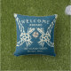 Welcome aboard outdoor throw pillow, beige color rope outline on an ocean blue color background with beige text. You can the boats name text to suit your boat using the "personalize this template" feature.