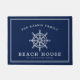 A navy and white welcome mat tailored to the proud beach house owner. It features a nautical vintage wheel followed by the family name above and est date and location below.