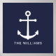 Modern Minimalist Nautical Poster featuring white anchor with personalised name in white modern sans serif font style on navy blue background.