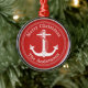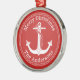 The nautical design on this ornament has a white anchor with a circular rope border. Text reads "Merry Christmas". Personalise with your own family name. Red background may be customised to change to another colour.