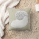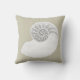 A detailed image of a nautilus shell decorates this accent pillow. The background is a sandy beige. This pillow is perfect for nautical themed interior decoration in a beach house or a coastal home.
