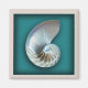 The inner shell of a nautilus on a teal background set in a shadow box effect with a beige mat.