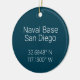 Ceramic keepsake ornament features latitude and longitude map coordinates for Naval Base San Diego in California - also known as 32nd Street Naval Station, home of the Pacific Fleet