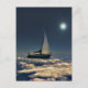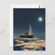 Dreamy fantasy digital photo collage of a man navigating with a sailboat through the clouds with the moon a clean dark blue sky at the background.
