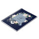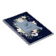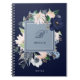This stylish and beautiful notebook features a frame of navy blue, light blue, and blush pink nautical coloured watercolor flowers with green and neutral beige leaves, and your name and monogram or initial in the centre. The background is a dark, navy blue.