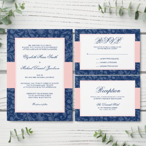 Navy and Blush Pink Damask Swirl Wedding SuiteDesigned by Print Creek Studio Inc