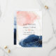 Wedding save the date card featuring navy blue and blush pink watercolor paint splashes and a gold geometric frame.