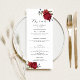 Elegant floral wedding dinner menu card featuring watercolor illustration of navy and burgundy peony flowers with greenery.