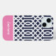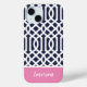 Stylish custom phone case in navy blue, pink and white colours. This design features a preppy Moroccan trellis pattern. Personalise it with your name or other custom text in a modern script monogram font. Use the design tools to choose any background colours, edit the text fonts and colours and upload your own photos to create a unique one of a kind device cover!