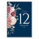 This elegant table number card features an exquisite dusty rose flower arrangement leaves on a rich navy background. You can enter each table number separately in the customise menu. This is part of a matching wedding suite that includes menus, wedding invites and more.