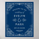 Make a bold entrance with this striking navy and silver art deco wedding welcome sign. Ornate scrollwork borders and elegant typography create a sophisticated vintage feel with a dramatic colour palette. Fully customisable with your names and wedding date for a glamourous reception or ceremony display.