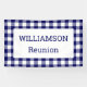 Help guests find your party with a custom banner featuring a classic navy blue and white buffalo check border with your text in a white rectangle in the centre. Perfect for a family reunion, barbecue, or picnic. Personalise it in the sidebar.