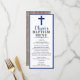 A navy cross sits above a modern 3-course menu, with choice of entree and dessert. A rustic menu with a faux wood panelling on the back, perfect to set down on the tables before guests flip them around to reveal the nights' courses. Available on a traditional 4"x9" elegant card.