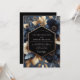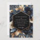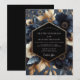 This design features a dramatic display of deep navy blue and cream blossoms with accents of muted gold foliage. The rich floral arrangement evokes a sense of opulent beauty and romantic depth, perfect for an elegant affair.