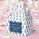 Navy blue anchor custom nautical wedding party favour box with handle. Add your own custom thank you message and name or monogram letters of bride & groom plus date of marriage. Cute maritime ship anchor symbol pattern print with classy bracket label on both sides for newly weds couple. Customisable background colour. Thank your guests for coming in style. Luxury give away for guests, friends and family. Also nice for thanking bridesmaids, flower girls and groomsmen. Elegant typography template. Personalised boxes printed with popular boat anchor icon. Add your own contents. Put in things like souvenirs, candy, dried fruit, homemade food, toy, chocolate kisses, cookies, m&m's, jelly beans, truffles, nuts, small drinks, sailing or boating gift item, etc. Trendy party supplies and accessories for your special day and venue. Also nice for beach themed bridal shower, romantic engagement, sailor's birthday, baby shower, business event or anniversary. Change quantity to get the cheap bulk price. Anchors aweigh! for married couples.