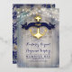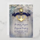 Coastal or seaside wedding invitations feature a gold foil anchor, navy blue monogram, a string of lights, and rustic distressed driftwood background.