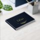 A beautiful gold foil wedding guestbook in a deep rich navy blue with a delicate floral circle in gold
