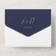 All in one navy blue and gold wedding invitation featuring elegant hearts script typography and monogram initials. The invitation includes a perforated RSVP card with your wedding website QR code and details. Designed by Thisisnotme©
