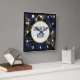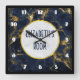 A clock with a stylish and elegant background of navy blue and gold marble. Layered over top is a circle with a faux gold foil border with your personalised text inside.