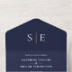 This chic minimalist all-in-one wedding invitation can be personalised with your monogram initials and wedding day information on a navy blue background. The invitation includes a perforated RSVP with your wedding website QR code and details. Designed by Thisisnotme©
